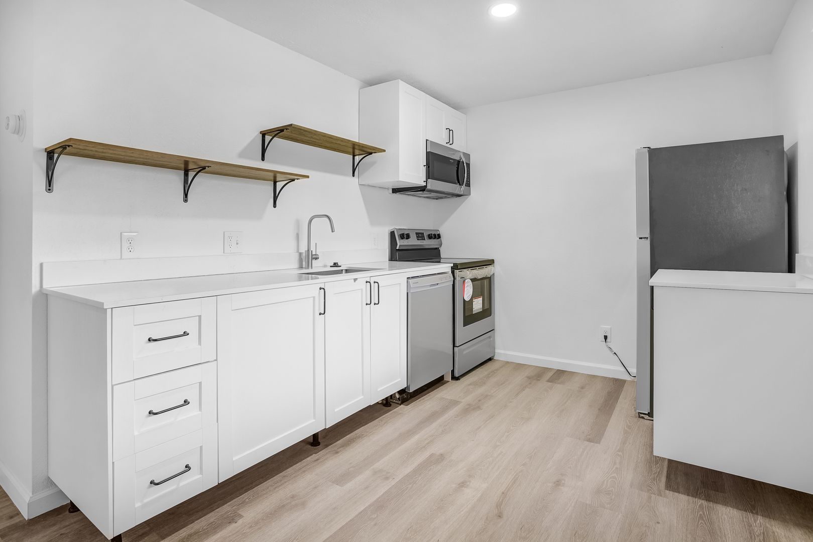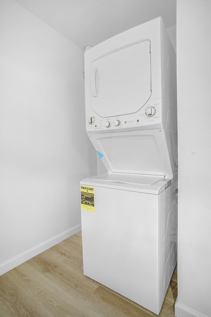 This unit includes a washer and dryer, range with electric stove, microwave, dishwasher, and refrigerator.
